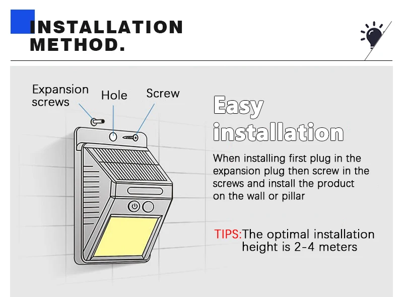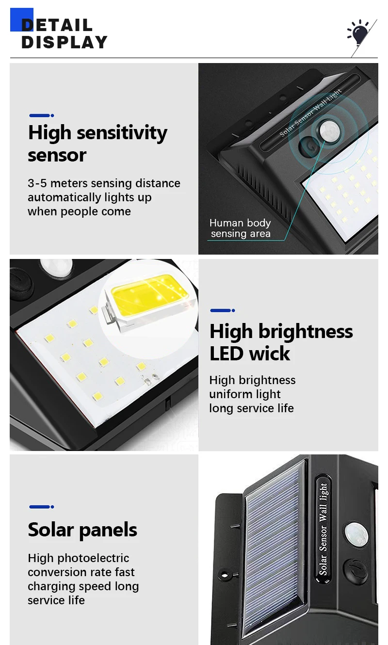 4.3 Lighting mode: (1). Induction mode (the light goes out and lights up 20-25s after the person) 2. Induction+micro brightness mode (the person comes and lights up, the person goes and lights up slightly, with a brightness of 10%) (3). Non sensing mode, 50% light 5. Battery life: 6-8 hours of daytime charging, 50 times per night